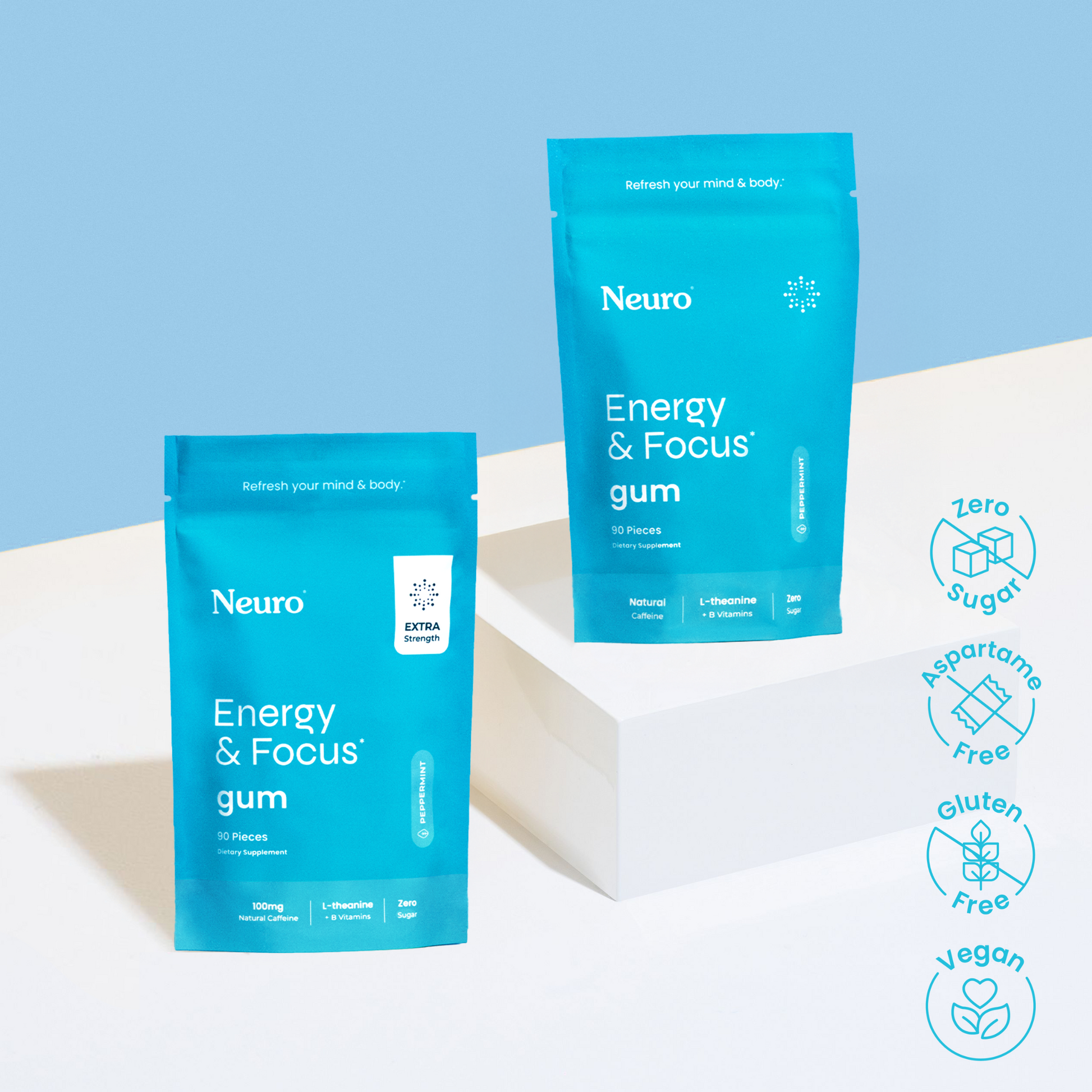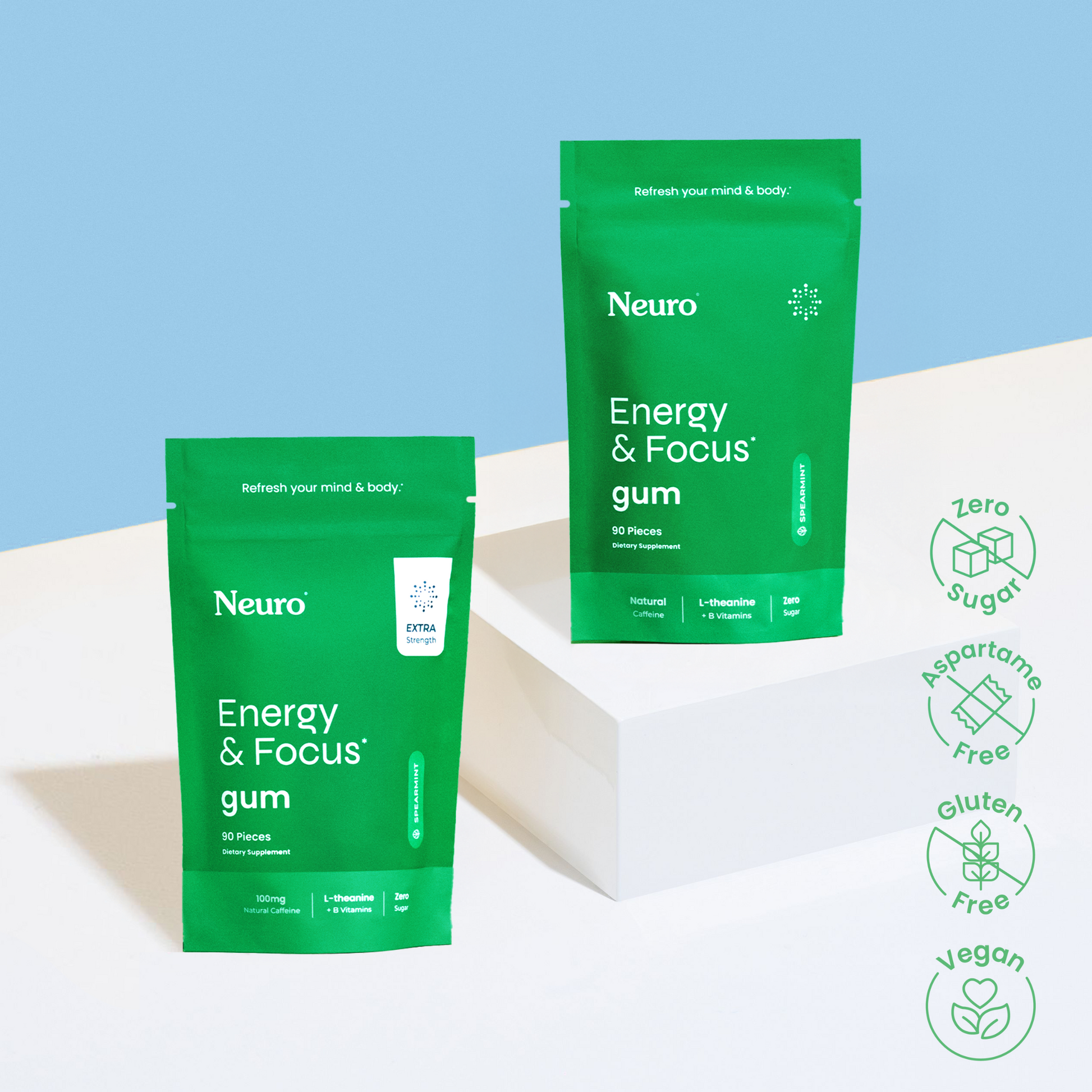 This bundles includes Energy & Focus Gum 90-piece Bulk bag Peppermint or Spearmint and our Extra Strength Energy & Focus Gum 90-piece Bulk bag Peppermint or Spearmint.