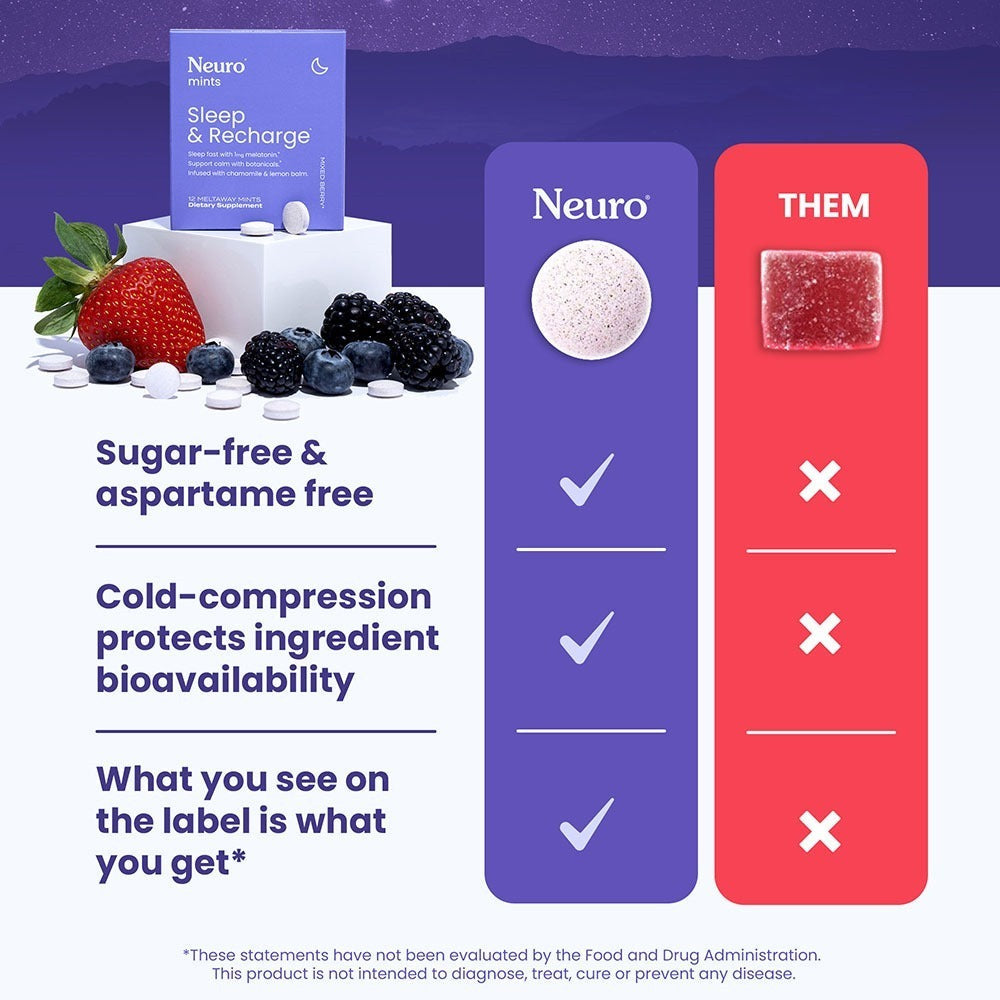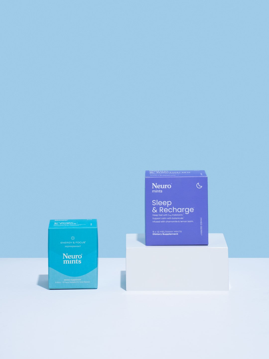 When it comes to taking on big goals, we need energy levels that match the mission. Neuro Energy and Focus Mints use a vegan, zero sugar, and aspartame-free nootropic blend of natural caffeine, L-theanine, and B-vitamins to give you the mental energy boost you need to tackle your day. When you pair it with Neuro Sleep & Recharge meltaway mints you will wake up feeling rested, recharged, and ready to take on the busy day ahead